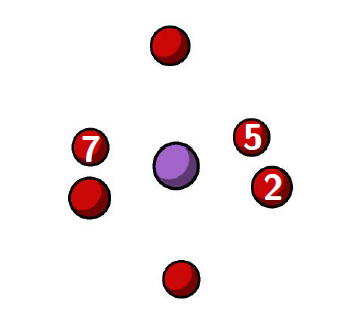 The next step in this tutorial is to calculate the diffusion barrier for the electron hole migration. To calculate the activation energy, it is necessary to calculate the minimum energy pathway for hole migration. Below, the 7 atom QM region is shown with the three of the oxygens labelled. There are two cases that can be considered for hole migration, one where the electron hole moves to an oxygen which is opposite (eg: oxygen 7-2), or alternatively where the electron hole moves to an equatorial oxygen (eg: oxygen 7-5 or oxygen 5-2). To calculate the minimum energy pathway, a nudged elastic band (NEB) calculation can be used.