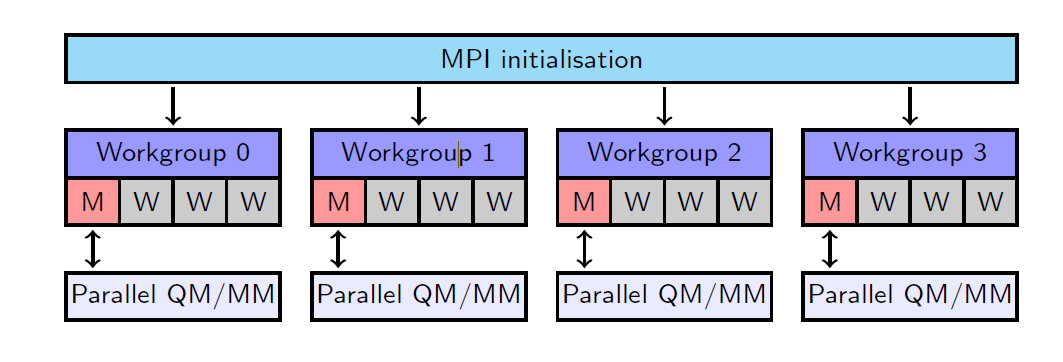 Flowchart of the taskfarmed parallelisation for 16 processors and 4 workgroups.